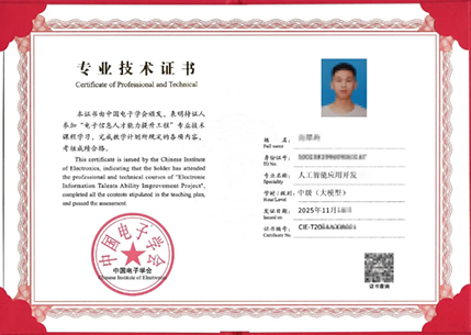 • 该认证证书,不仅可为用人单位提供专业人才技能评估参考,还可供高校学生或人工智能领域工作的人员自我评估。完成授权认证项目课程学习并考试合格后,将由中国电子学会指导并颁发《人工智能应用开发-中级(大模型)》专业技术证书。该证书可作为专业技术人员考核评价、岗位聘用、职称评聘和执业注册的重要依据。